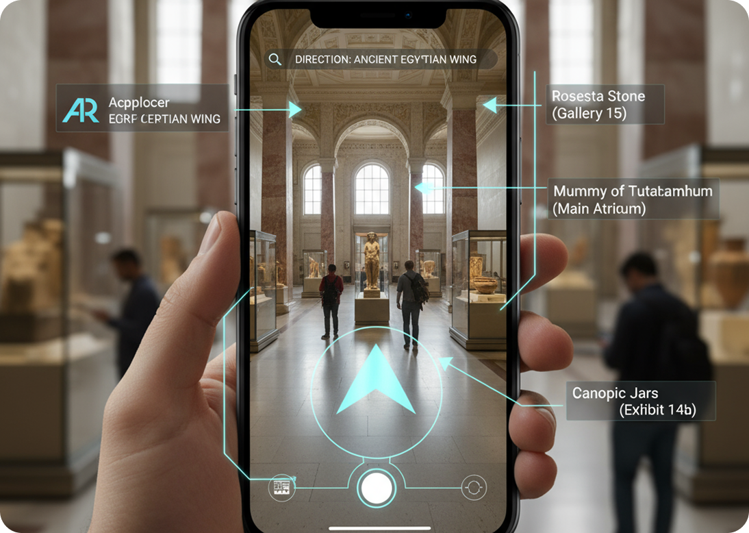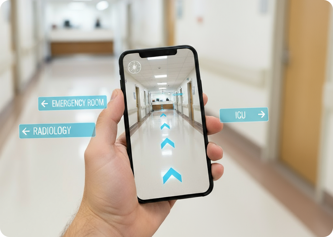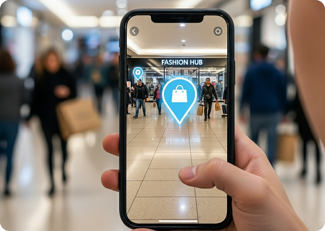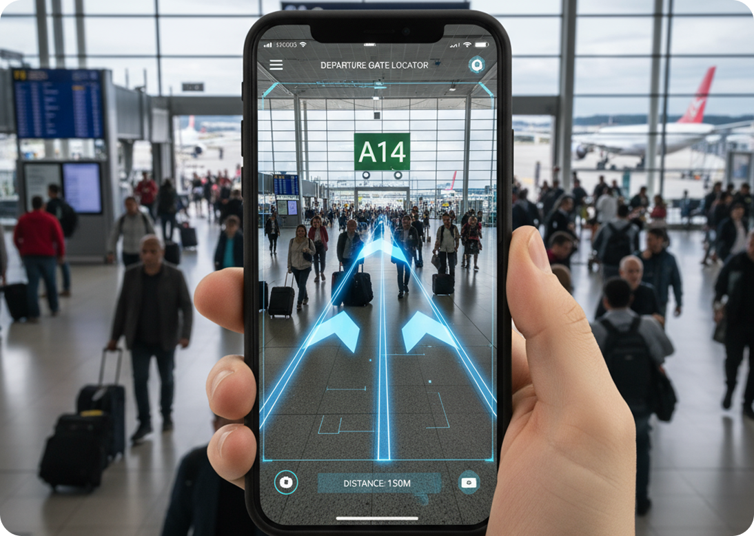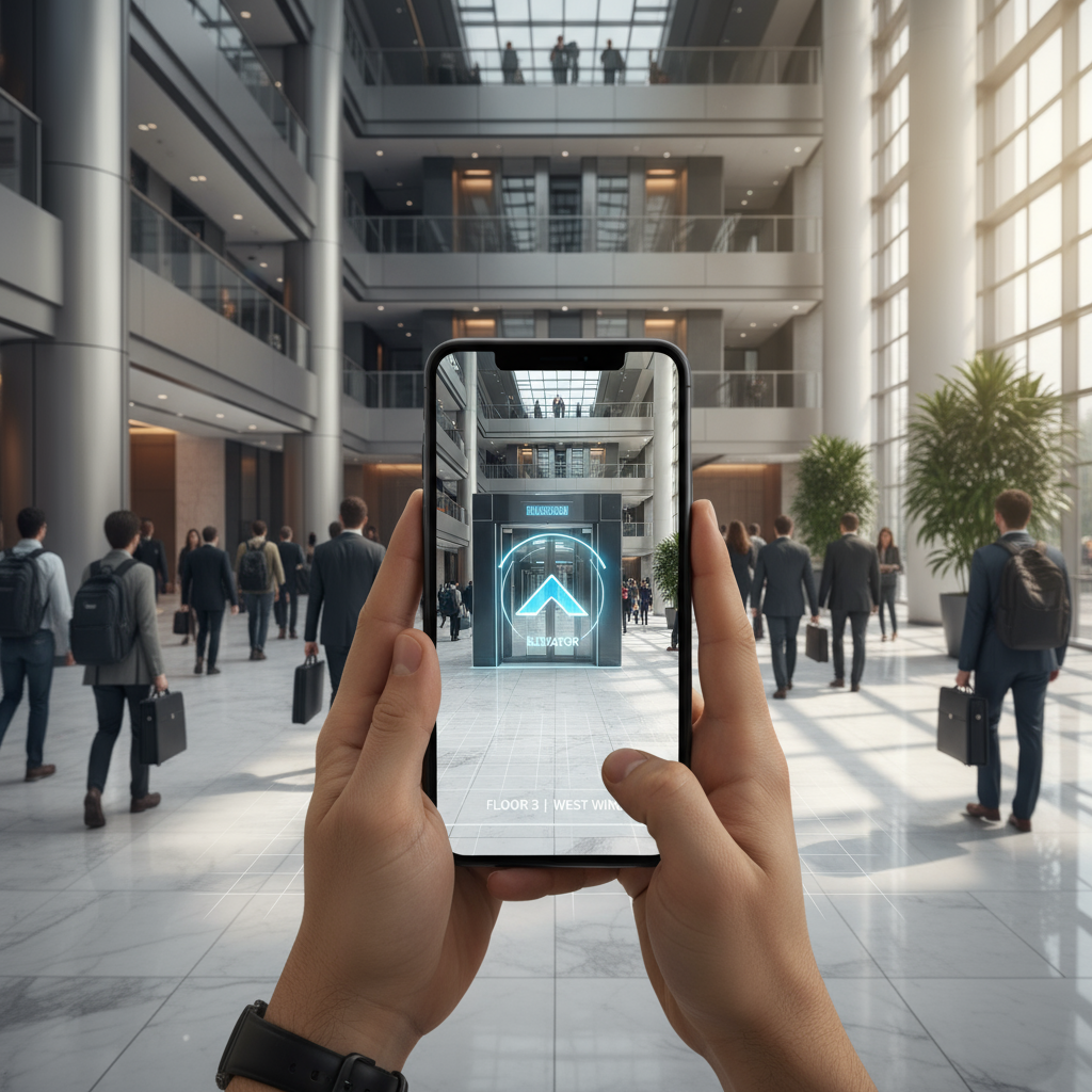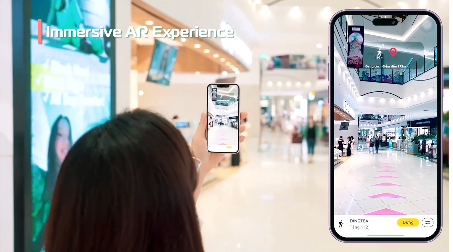 Giải pháp Wayfinding bằng công nghệ AR (thực tế tăng cường) mang đến một trải nghiệm định hướng hoàn toàn mới. Thông qua camera điện thoại, người dùng có thể quan sát các chỉ dẫn ảo – mũi tên, tuyến đường, biểu tượng – được hiển thị trực tiếp lên không gian thực tế xung quanh họ.